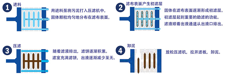 污泥通過進料泵打入壓濾機中(通常進料口為中進料),固體均勻地在每個濾室中累積。固體首先在濾布表面累積。大部分的固液分離其實式通過濾布表面累積的污泥層實現的。一開始,會有細小的顆粒透過濾布逃出,所以一開始的濾液會有些許渾濁,待濾布表面泥層逐漸形成,濾液會清澈起來。泥層逐漸變厚,形成泥餅。濾餅也會起到過濾作用,濾液越濾越清。
