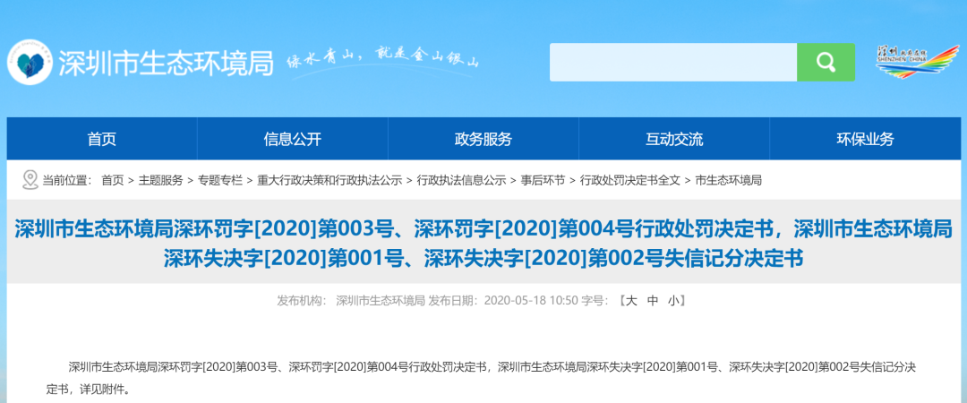 2020年5月15日—18日,深圳市生態(tài)環(huán)境局作出《深環(huán)罰字[2020]第001號(hào)》、《深環(huán)罰字[2020]第002號(hào)》,《深環(huán)罰字[2020]第003號(hào)》、《深環(huán)罰字[2020]第004號(hào)》、《深環(huán)失決字[2020]第001號(hào)》、《深環(huán)失決字[2020]第002號(hào)》。