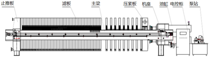 快開式壓濾機主要由過濾機設備架、過濾部分、液壓部分、電氣控制和卸料機構等,其中過濾機設備架是壓濾機的基礎構建,由主梁、油缸、止推板等部件組成;過濾部分由濾板、濾布和配板等組成,電氣控制部分主要由電控柜、開關等一系列電氣元件組成;卸料機構由傳動機構、驅動機構等組成。