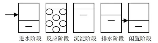 根據(jù)時(shí)間進(jìn)行劃分的間歇式活性污泥法可統(tǒng)稱為SBR法。典型SBR工藝過程的一個(gè)完整運(yùn)行包括五個(gè)階段,依次為:進(jìn)水階段-加入基質(zhì);反應(yīng)階段-基質(zhì)降解;沉淀階段-泥水分離;排水階段-排出上清液;閑置階段-等待下一次進(jìn)水。SBR法污水處理工藝流程如圖2所示。