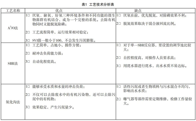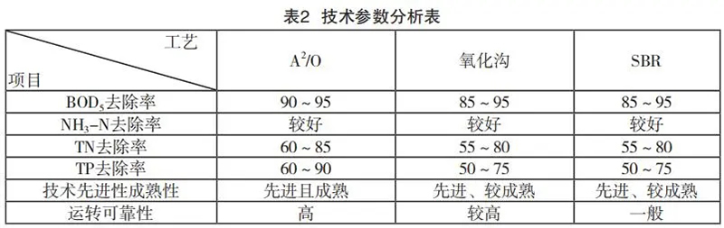A2/O工藝、SBR工藝和氧化溝工藝的工藝技術(shù)分析和技術(shù)參數(shù)分析見表1和表2。